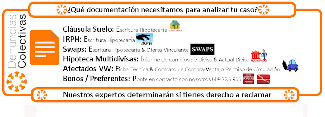 Para que podáis enviar la documentación vamos a daros todas las facilidades posibles, las vías de envío de documentación de Denuncias Colectivas son las siguientes: Junto a la documentación (Copia de la escritura o préstamo hipotecario) debes incluir tus datos de contacto: Nombre – Apellido – Provincia – Email – Nº de Teléfono – Entidad Bancaria.